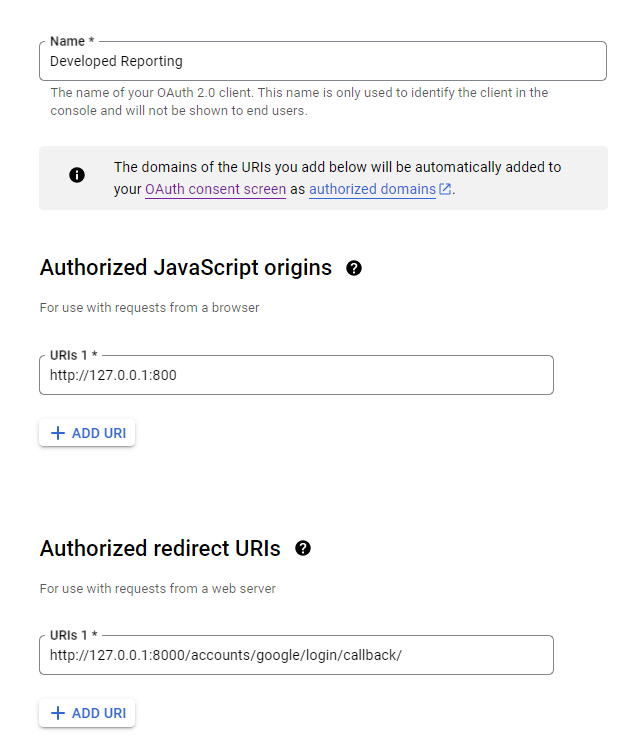 - Add the domain name to the javascript origins and the redirect link. (Note: see here for issues with HTTPS in production)